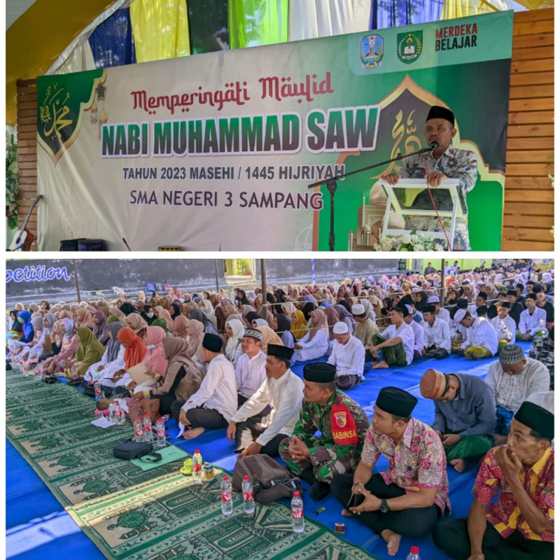 Sampang (26/10/23) - Sempat tertunda karena renovasi sekolah, Peringatan Maulid Nabi Muhammad SAW berlangsung di lapangan olahraga SMAN 3 Sampang. Dihadiri oleh segenap masyarakat Smaga Sampang seperti Lurah Banyuanyar (Moh. Ajir), Babinsa (M. Jayyadi F), Ketua RT sekitar sekolah sehingga acara maulid ini dapat berlangsung lancar dan hikmat.