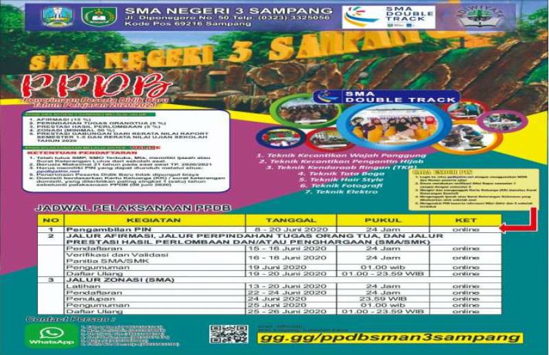 Informasi lebih lanjut, terkait dengan pendaftaran dan syarat pelaksanaan PPDB jenjang SMA/SMK Tahun Pelajaran 2020/2021 di SMAN 3 SAMPANG dapat di akses melalui website resmi www.smagasampang.sch.id