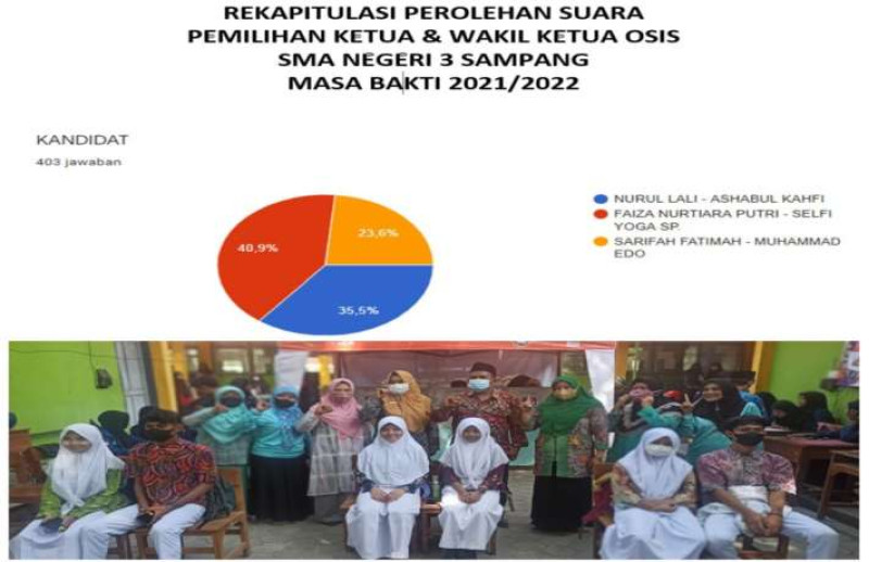 Jumat (29/10/21) pemilihan ketua OSIS merupakan kegiatan rutin tahunan di setiap sekolah, mulai SMP sampai SMA, tak terkecuali di SMA negeri 3 Sampang. Acara tersebut merupakan ajang pesta demokrasi ditingkat lembaga pendidikan. Pesta demokrasi ini diikuti oleh seluruh civitas akademika SMA negeri 3 Sampang. Terdapat 3 pasangan calon ketua dan wakil ketua OSIS, diantaranya adalah paslon nomer urut 1 yaitu Nurul Laili dan Ashabul Kahfi selanjutnya Faiza Nurtiara P dengan Selfi Yoga SP lalu paslon nomer 3 Sarifah Fatimah dan Muhammad Edo. Pemilihan ketua kali ini dimenangkan oleh paslon nomer urut 2 dengan perolehan suara sebanyak 40,9%. Sementara nomer satu dan tiga masing-masing memperoleh suara 35,5% dan 26,3%, dengan tingkat partisipasi siswa dan guru sebesar 75%. Wakasek kesiswaan H. Mulyadi, S.Pd menjelaskan jika pemilihan tahun ini menggunakan sistem E-voting lewat aplikasi google form. "Ini merupakan tahun perdana kami menggunakan sistem E-voting, mudah-mudahan untuk tahun selanjutnya tetap menggunakan sistem ini karena efektif dan efisien", tegasnya.